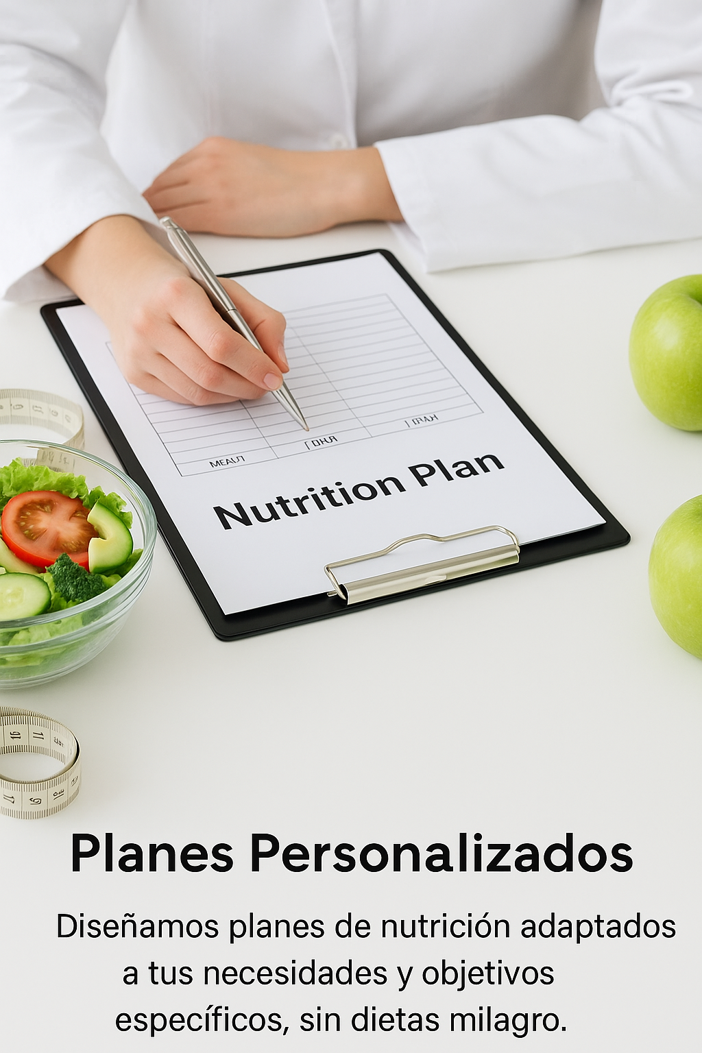 Diseñamos planes de nutrición adaptados a tus necesidades y objetivos específicos, sin dietas milagro.